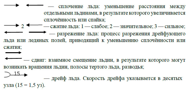 Основные навигационные характеристики, определяющие сплочённость, возраст и формы льдов, приводятся в овале: