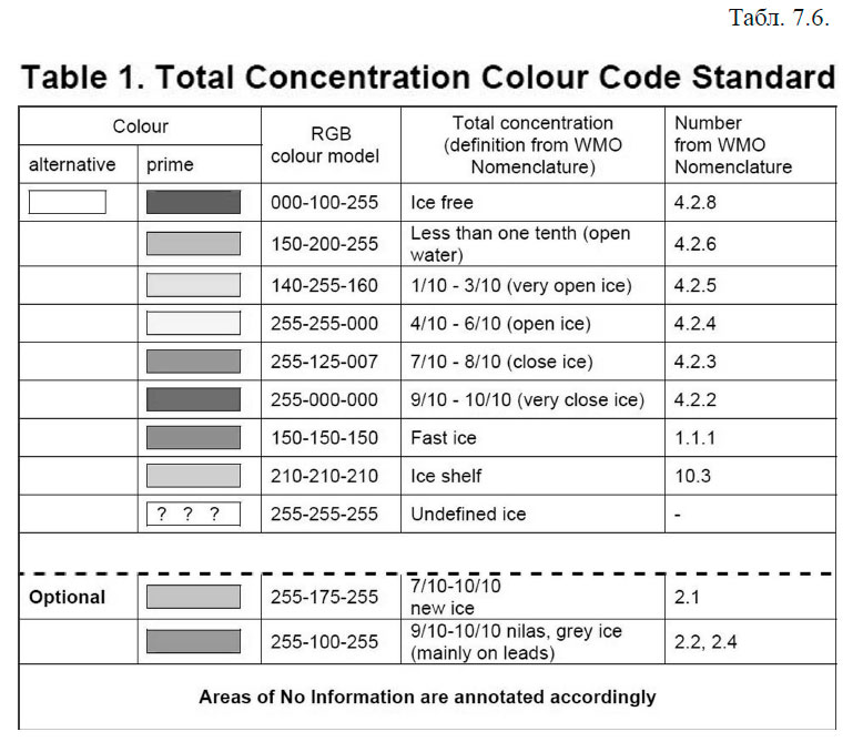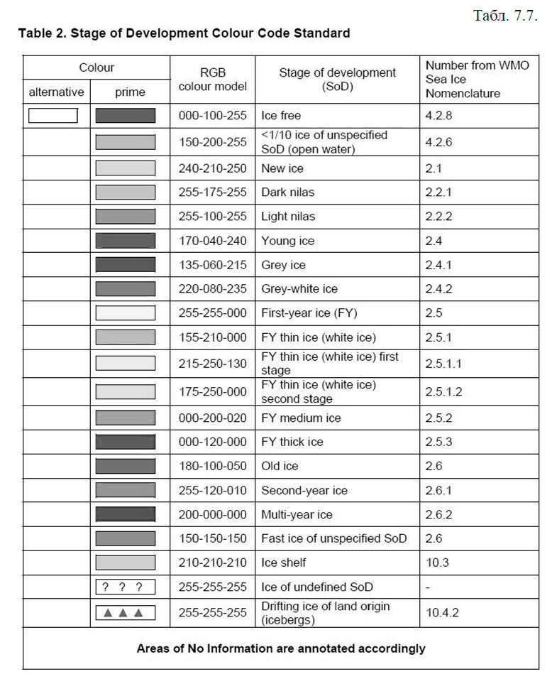 В табл. 7.7 представлена шкала цветов для обозначения стадий развития льда. Эта таблица используется в зимний период навигации, когда изменения сплочённости невелики (она на всей акватории высокая 10/10), а изменения стадий развития льда (толщины) значительны.