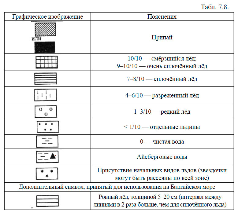 Сведения о морских льдах передаются на суда в виде оперативных ледовых карт. В настоящее время в Российской Федерации для составления ледовых карт применяются условные обозначения, рекомендованные Всемирной метеорологической организацией (ВМО), а для внутреннего использования — национальный набор ледовых символов. Поскольку практически все страны, которые составляют ледовые карты для обеспечения ледового плавания, используют условные обозначения, рекомендованные ВМО, то их мы и рассмотрим. Основным документом ВМО по составлению ледовых карт является «Ice chart colour standart».