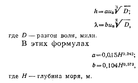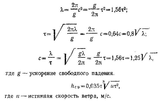Элементы волн существенно зависят от глубины моря. Для мелководных районов расчет высоты и длины волн, м, рекомендуется выполнять по формулам: