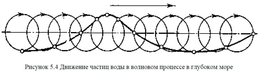 В поступательной волне все частицы воды, находящиеся на одинаковой глубине, описывают в течение периода волны одинаковые орбитальные пути (Рис. 5.6).