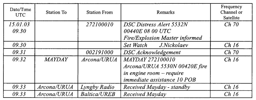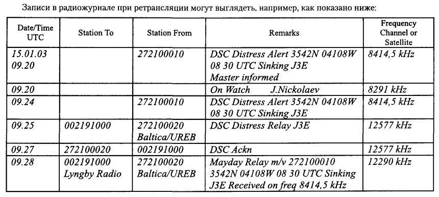 Здесь вызов бедствия получен на частоте 8414,5 кГц от судна 272100010, подтверждение от береговой станции не принято, радиообмен на телефонной частоте бедствия 8291 кГц не прослушивается. Вторично получен вызов бедствия на той же частоте. В соответствии с циркуляром 25 COMSAR сделана ретрансляция на береговую станцию 002191000 Lyngby Radio. Для ретрансляции выбран частотный поддиапазон 12 МГц.
