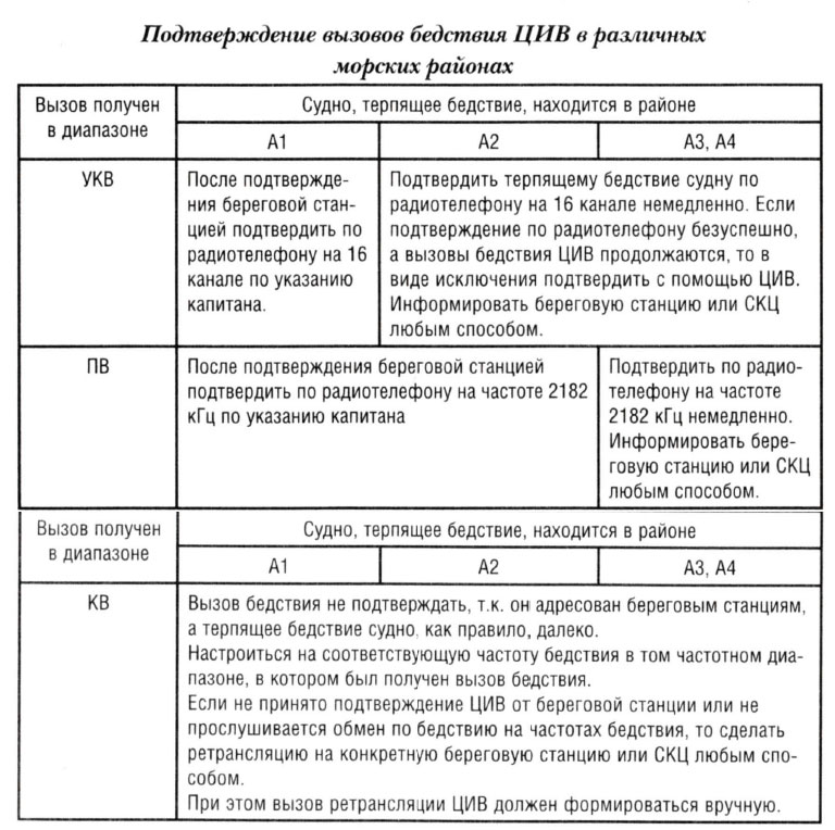 Правила подтверждения вызовов бедствия ЦИВ судовыми станциями в зависимости от района, в котором в данный момент находится судно, и диапазона частот, приведены ниже.