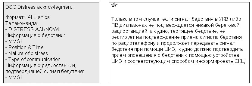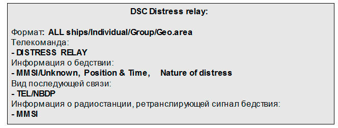 - Подтверждения вызова бедствия (как правило, только береговые радиостанции), ретрансляции вызова бедствия.