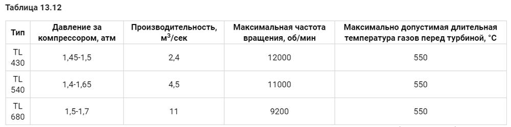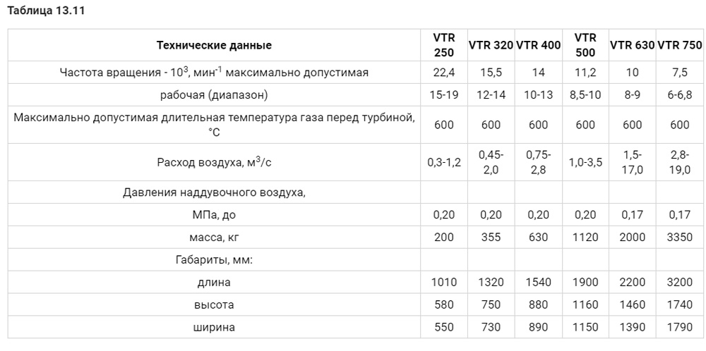 В таблице 13.11 приведены технические характеристики турбокомпрессоров.