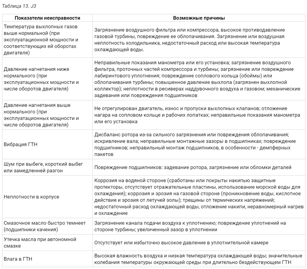 При эксплуатации двигателя срыв потока в элементах проточной части компрессора ГТН (лопатки ВНА и рабочего колеса, диффузора) и неустойчивость его напорных характеристик могут быть вызваны различными факторами, главные из них следующие: загрязнение лопаточного диффузора и выходной улитки; закоксовывание продувочных и выхлопных окон; загрязнение или повреждения сопловых лопаток турбины; отключение отдельных цилиндров из действия; загрязнение воздушного фильтра; отдельные неблагоприятные режимы работы двигателя (малая частота вращения, быстрая остановка двигателя с полного или среднего хода, изменение атмосферного давления, волнение моря и оголение винта, плавание во льдах).