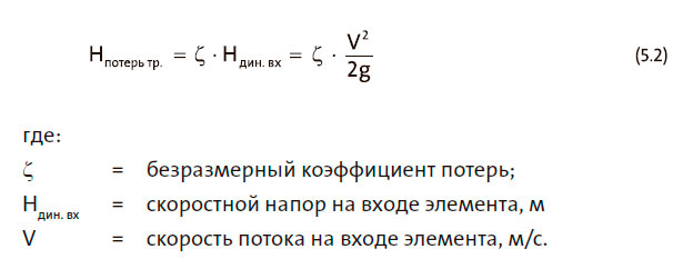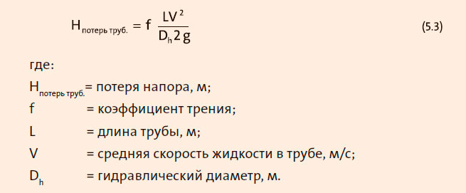 Потери в трубе зависят от скорости жидкости, гидравлического диаметра трубы, ее длины и шероховатости внутренней поверхности. Падение напора рассчитывается следующим образом: