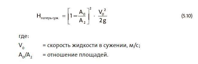 Обычно, полагают, что ускорение потока жидкости от скорости V1 до V0 происходит без потерь, в то время как последующие потери на перемешивание зависят от отношения площади A0 к площади сужения потока A2, а также от скорости потока: