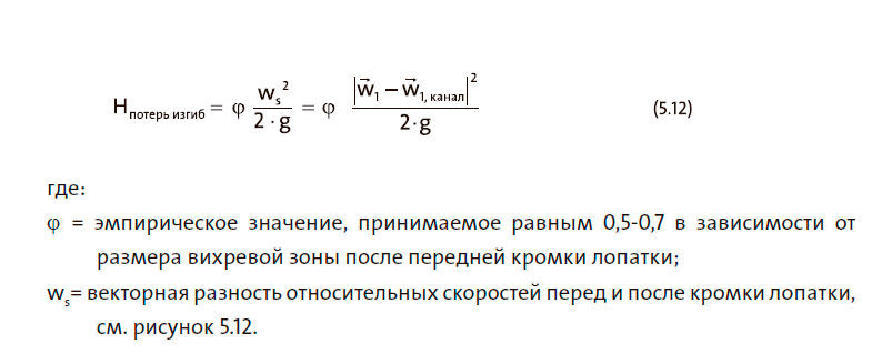Величина потерь при изменении направления потока зависит от разницы относительных скоростей перед и после передней кромки лопатки и рассчитывается с помощью следующей формуы (Pfleiderer og Petermann, 1990, стр. 224):
