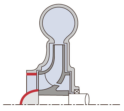 При расходе, отличном от расчетного, потери при изменении направления потока также возникают у выступа спиральной камеры. Чтобы свести к минимуму потери при изменении потока, конструктор должен обеспечить совпадение углов прохождения потока и расположения лопаток. Скругление концов лопаток и выступа спиральной камеры позволяет снизить потери при изменении направления потока.