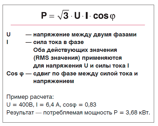 Для стандартного электродвигателя без преобразователя частоты связь между напряжением (U), силой тока (I), и мощностью (Р) представлена формулой справа. Эту формулу нельзя использовать при расчете потребляемой мощности для электродвигателей с преобразователем частоты.