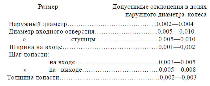 Ориентировочные значения допустимых отклонений размеров рабочих колес не должны превышать следующих значений: