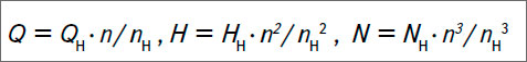 Характеристики каждого насоса при номинальной частоте вращения приводятся в формулярах насосов. Имея характеристики насосов при номинальной частоте вращения пя, можно с достаточно высокой для практических целей точностью определить параметры его работы на промежуточных частотах вращения п, полагая, что при прочих равных условиях расход прямо пропорционален частоте вращения, напор — квадрату ее, а мощность — кубу: