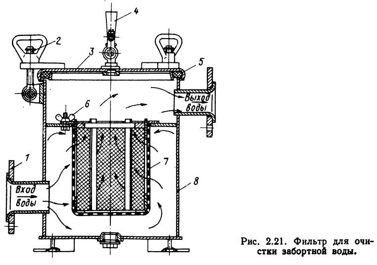 Для очистки забортной воды от ила и песка на всасывающих трубопроводах пожарных и балластных насосов кроме сеток устанавливают грязевые коробки или фильтры. Показанный на рис. 2.21 фильтр состоит из сварного корпуса 5, фланца 1, крышки 3, уплотняемой резиновой прокладкой 5, и фильтрующего стакана 7, обтянутого мелкой металлической сеткой. На верхней части крышки фильтра для отвода воздуха имеется кран 4 с трубой, выведенной выше ватерлинии судна. Быстрота разборки и сборки фильтра обеспечивается наличием откидных болтов 2 и барашка 6.